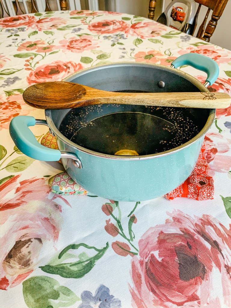 Add your choice of herbs. Once liquid has halved in sized, remove from heat and let cool.